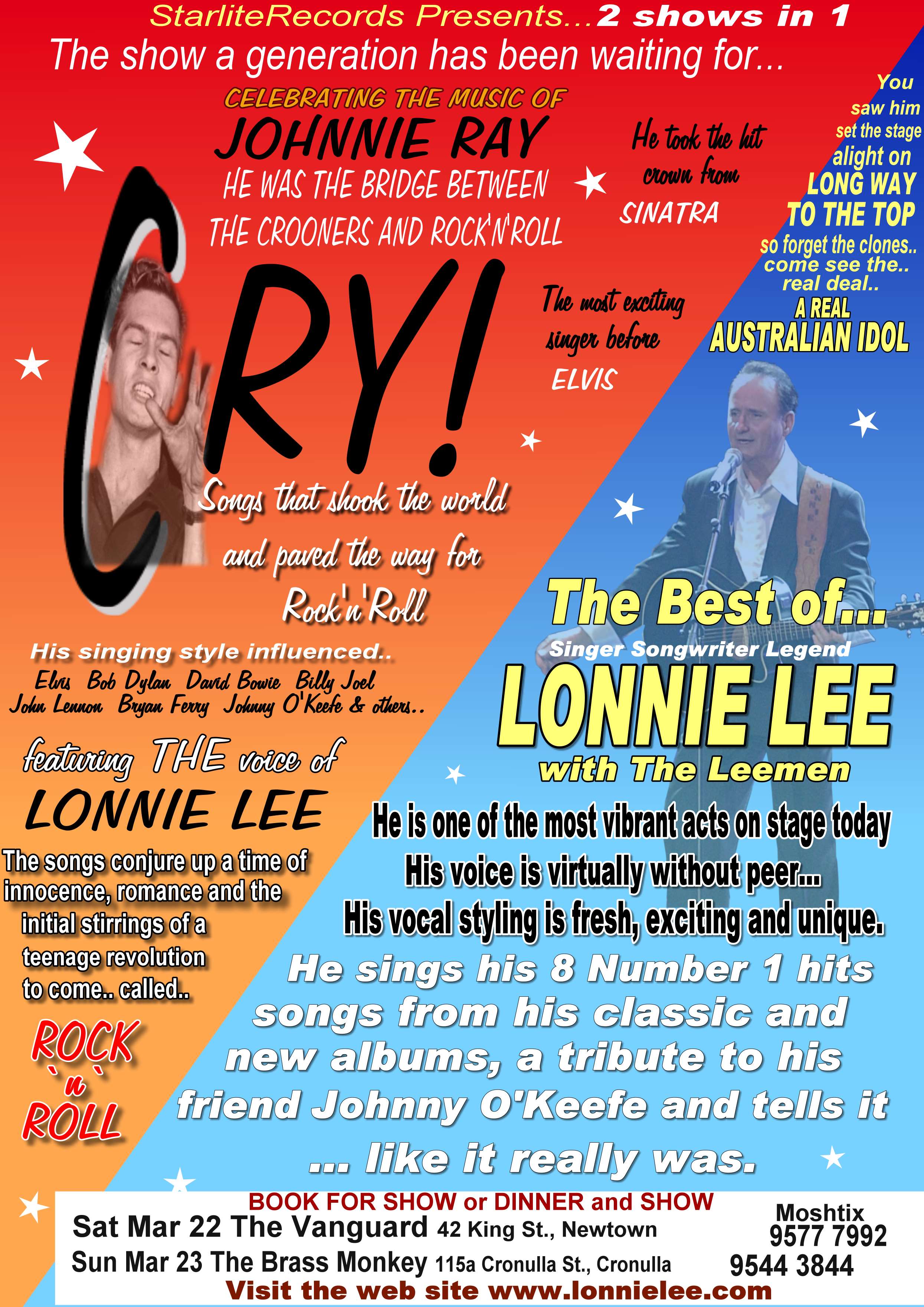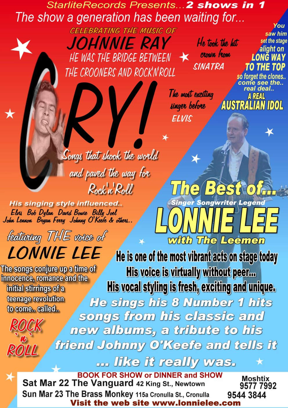 WHY GIVE EDITORIALS AND MEDIA SPACE TO LONNIE AND THIS SHOW? Since his first flirtation with a microphone on stage in May 1956 right up to today, he stands unique, youthful and vibrant as ever. Of all the stars of Australia's original Rock'n'Roll Hit era when the Hit parade was something exciting and new and when Black and White TV was even more 'space age' than how the teenagers of today see Ipods, Lonnie is the only one in Australia still standing with his own band as a 'today' performer. According to their own stories, he was a major influence to later stars such as Billy Thorpe, Ross Wilson, Angry Anderson, Chain, Russell Morris, Jim Keays and many others and is still today encouraging performers to 'keep at it' and not to give up when all seems hopeless. He still writes, produces and releases songs which get major radio play across Australia, tours extensively with his own show and receives accolades as a 'today' performer winning performer awards. His peers from around the world respect him as a unique authentic 'rock star'. He has been inducted into various Hall of Fame organizations and is constantly consulted by radio, TV and press for the 'facts' about the beginnings and growth of the Australian Music Industry. A recent one was the Warner Bros TV doco and DVD shown on ABC TV in November 2008 titled, 'The Wild One' The story of Johnny O'keefe. He has written and published a series of 'Fact' books about the Australian music industry including.. Six O'Clock Rock - The Facts and 'Johnny O'Keefe - The Facts. His achievements overseas are well documented and include writing with and for Roy Orbison, being inducted as an Honorary Member of the US House of Representatives for his work in his field, starting and running the first computerized in dependant record promotion company in Nashville and Las Vegas and being a co founding director of the American Society of Country Music in Las Vegas Nevada. His experiences read like a Who's Who of the world entertainment industry, forming the basis for his own auto biographical book. Starlite Records currently have on release 23 CDs, 3 DVD's and many other merchandise items on their web site and in many stores and are constantly recording new material either from the Lonnie Lee archives or from his new songwriting collections. WHY NOT GIVE EDITORIALS AND MEDIA SPACE TO LONNIE AND THIS SHOW! If the above CV isn't taken seriously and then credit given to one of the only Australian performers who we can rightfully call a true 'Music Legend', then the Australia media has been hijacked by biased, tunnel visioned employees who don't know and possibly don't care about the overall entertainment industry. Virtually every day the press features stories and pictures of people who appear on shows such as Australian Idol and yet they will not give space to performers who are part and parcel of the fabric of Australia's social conscience and history. Performers who still attract many thousands of people to their concerts every year, who buy truckloads of their CD and DVD product. Yes publicity should be given to these new performers reaching out and trying to grasp on to something that may lead to success, but not at the expense of those before them who have paid their dues and who are still alive and well today giving joy to many who attend their shows. The Australian entertainment 'turn over' mill is unlike any around the world, virtually only interested in the 'new' performers on mass appeal TV shows or major label acts who have massive publicity resources at their disposal. Then again if booze, drugs, bashings, rapes or other negatives come to play there is a chance the established performers may get their story, but then again, not quite as planned. His is a 'real' story of interest to anyone who gazes at a TV set, reads a newspaper or magazine or listens to a radio station. This new CRY! Show is in itself a piece of history. It is the first time in the world the songs of the biggest pop star prior to Elvis, have been compiled into a show. Lonnie's edgy versions have zoomed them into today, even more so as Buble did with Frank Sinatra's songs. His American peers of equal status such as Roy Orbison, Buddy Holly, Johnny Cash, Jerry Lee Lewis and yes even the early Elvis, are revered by the Australian music industry and press, why not their own?